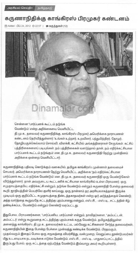 - Congressman denounced Karunanidhi ( கருணாநிதிக்கு காங்கிரஸ் பிரமுகர் கண்டனம் ) – 24-02-2012